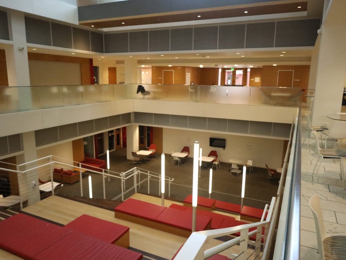 The courtyard offers a quiet space with minimal foot traffic, making it ideal for reading, reviewing notes, or practicing presentations. The peaceful atmosphere, combined with the gentle sound of the small water feature, creates an environment that promotes focus and retention.